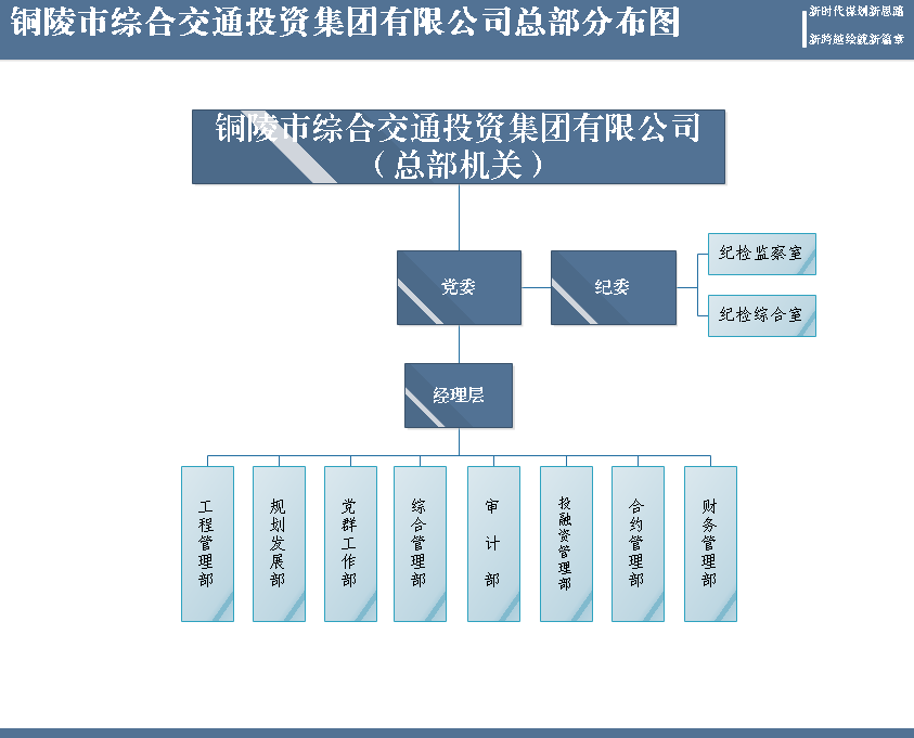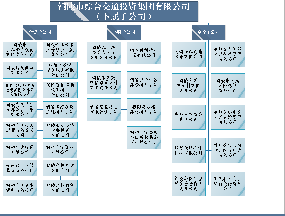 2017年8月18日,市委、市政府立足一江兩岸發(fā)展新局面,決定在原市交投公司整體劃轉(zhuǎn)新體基礎(chǔ)上組建集全市交通基礎(chǔ)設(shè)施項(xiàng)目投融資、開發(fā)建設(shè)和運(yùn)營管理、參與項(xiàng)目謀劃工作為一體的綜合交通投資集團(tuán)有限公司。注冊資本金109.77億元人民幣,企業(yè)主體信用評級“AA”等級,擁有全資子公司18家,控股公司10家,參股公司11家,是由銅陵市人民政府出資的市屬國有企業(yè)。