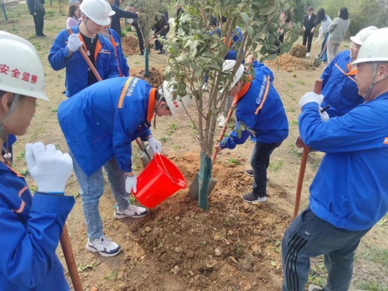 大家熟稔揮鍬、挖坑鏟土、輕放樹苗、回填澆水,現(xiàn)場歡笑聲連連,一片熱火朝天的景象。經(jīng)過每位工作人員的辛勤勞動,一棵棵桂花樹在G3公鐵橋項目管理用房空地“安家落戶”,為那里添上了一片新綠。