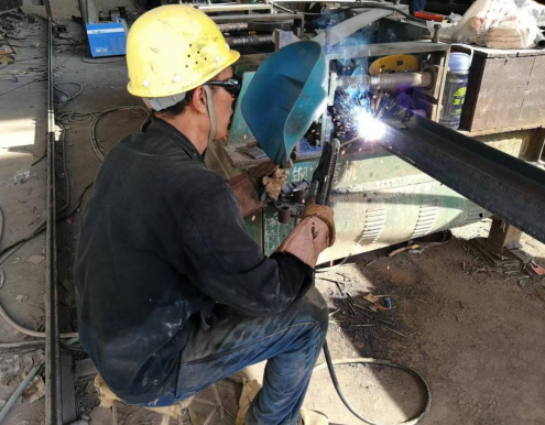 在鋼筋加工場內(nèi),鋼筋工人徐輝富正拿著電焊機在焊接工字鋼。在被太陽炙烤后滾燙的工字鋼和切割機飛濺的火星面前,厚厚的防護手套也顯得無濟于事,只見汗水不停地從他的額頭、兩頰滾落,雖然汗如雨下,他卻絲毫沒有停下手中的工作,而是認真地把握好每個細節(jié),確保焊接質(zhì)量。