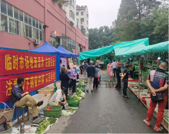 開業(yè)當(dāng)天,過渡市場(chǎng)整體環(huán)境整潔有序,標(biāo)識(shí)規(guī)范統(tǒng)一,市場(chǎng)管理、商戶經(jīng)營(yíng)都井井有條,前來買菜購(gòu)物的市民絡(luò)繹不絕。