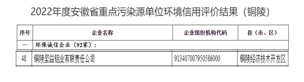 10月9日,市生態(tài)環(huán)境局對(duì)2022年度“安徽省重點(diǎn)污染源單位環(huán)境信用等級(jí)評(píng)價(jià)結(jié)果”予以公布,市交投集團(tuán)司屬堅(jiān)益鋁業(yè)公司經(jīng)過(guò)層層評(píng)選,成功榮獲“環(huán)保誠(chéng)信企業(yè)”稱(chēng)號(hào)。據(jù)悉獲評(píng)該項(xiàng)榮譽(yù)我市共計(jì)92家企業(yè)。