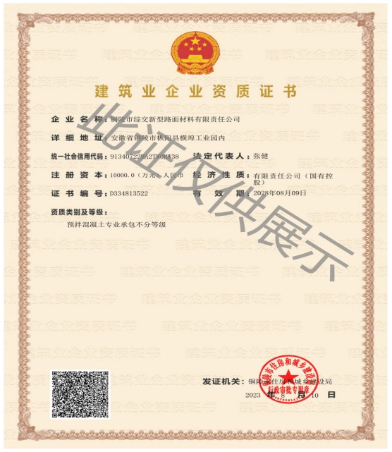 2023年8月,綜交新材料公司順利獲得建筑業(yè)企業(yè)預(yù)拌混凝土資質(zhì)證書,該項資質(zhì)的取得,標(biāo)志著綜交新材料公司在行業(yè)內(nèi)的重大突破,進(jìn)一步提升了在建筑行業(yè)內(nèi)的業(yè)務(wù)拓展能力和市場競爭力,更好地服務(wù)于G3銅陵長江公鐵大橋、G330一級公路改擴(kuò)建工程、江北港鐵路專用線及江北新區(qū)發(fā)展等重點項目的建設(shè),同時為綜交新材料公司在樅陽縣域混凝土市場上站穩(wěn)腳跟奠定堅實基礎(chǔ)。