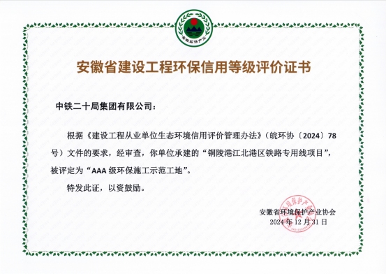 近日,安徽省環(huán)境保護產業(yè)協(xié)會公布2024年第5批建設工程從業(yè)單位生態(tài)環(huán)境信用評價結果,銅陵江北港鐵路專用線項目榮獲安徽省“AAA級環(huán)保施工示范工地”榮譽稱號。