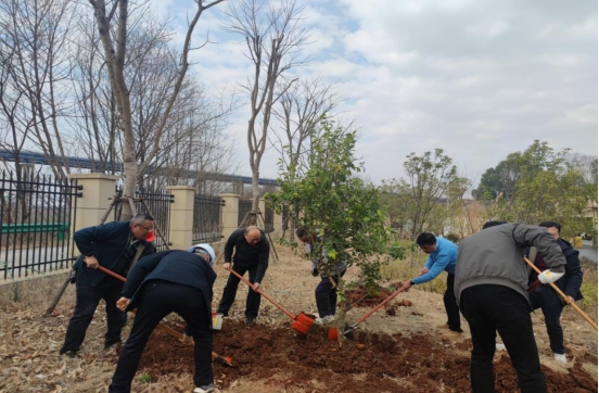 活動現(xiàn)場,處處洋溢著熱火朝天的勞動景象,黨員干部帶頭揮鍬鏟土,大家分組協(xié)作,挖坑、施肥、栽苗、培土、踩實(shí)、澆水井然有序,分別種植了桂花樹、柿子樹、橘子樹、桃樹、月季、映山紅等花卉樹木140余株,大力營造“三季有花、四季常綠”的生態(tài)景觀。