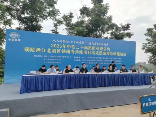為筑牢鐵路施工安全防線,切實(shí)提升突發(fā)事故應(yīng)急處置能力,6月25日下午,江北港鐵路專用線公司攜手廬江縣鐵路建設(shè)辦公室、羅河鎮(zhèn)人民政府,于江北港鐵路專用線項(xiàng)目跨合銅高速公路特大橋1#墩附近,聯(lián)合主辦了一場緊張有序的T梁架設(shè)高處墜落事故應(yīng)急演練。此次演練由中鐵二十局集團(tuán)有限公司銅陵港江北港區(qū)鐵路專用線項(xiàng)目經(jīng)理部承辦。