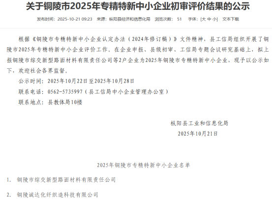 近日,樅陽縣工業(yè)和信息化局正式發(fā)布《關(guān)于銅陵市 2025年專精特新中小企業(yè)初審評價結(jié)果的公示》,綜交新型路面材料公司憑借在專業(yè)領(lǐng)域的技術(shù)積淀、創(chuàng)新能力及市場競爭力,歷經(jīng)企業(yè)自主申報、縣級部門初審、工信局專題會議研究等多環(huán)節(jié)嚴(yán)謹(jǐn)審核,成功入選初審名單,擬認(rèn)定為2025年銅陵市專精特新中小企業(yè)。