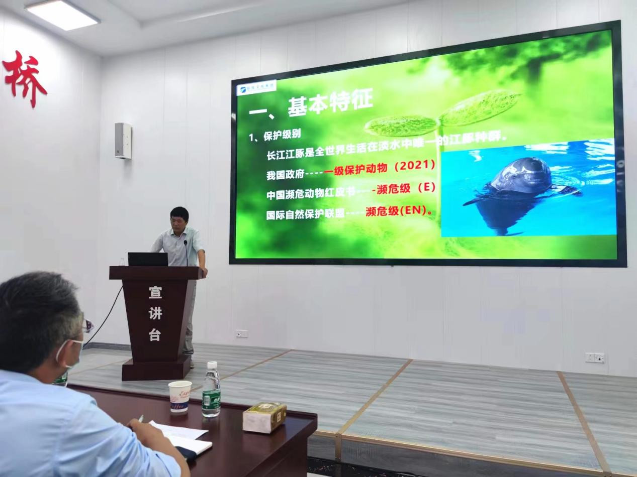在世界環(huán)境日活動(dòng)中,江豚保護(hù)專家鄭邦友結(jié)合自己近四十年江豚保護(hù)和科研經(jīng)歷,以詳實(shí)的視頻和照片,向參訓(xùn)人員介紹了長江江豚的基本特征、救護(hù)要點(diǎn)和運(yùn)輸方法,并現(xiàn)場發(fā)放環(huán)保宣傳手冊,切實(shí)提高G3公鐵橋參建人員的環(huán)保意識。