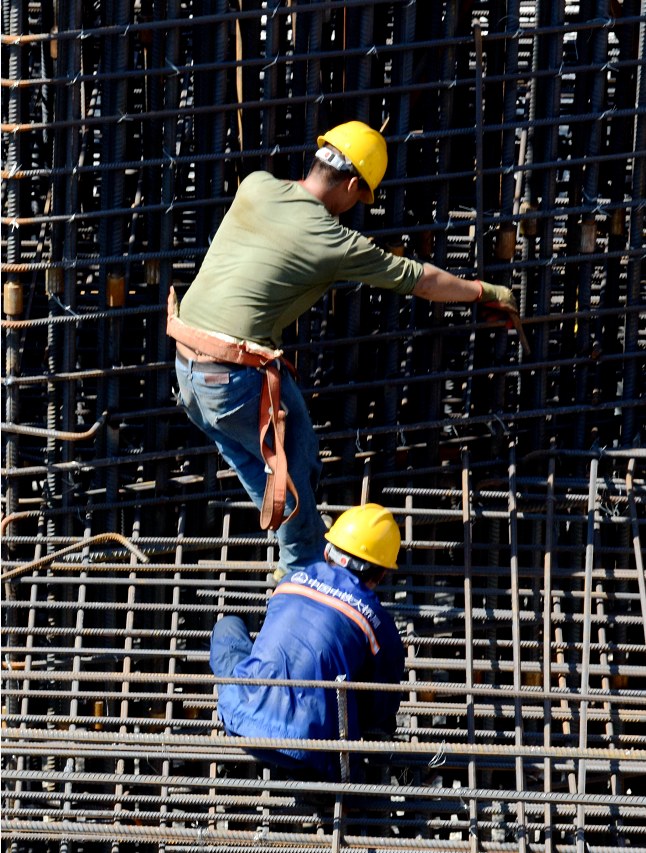 焊花飛舞、機(jī)器轟鳴,上午6時(shí)不到,鋼筋綁扎工劉友勇就和工友穿梭在“鋼筋森林”中。在下游側(cè)承臺9米多高的作業(yè)平臺上,劉友勇像蜘蛛人一樣緊貼著剛捆扎好的“樹干”,正在綁扎南主墩塔座鋼筋。承臺上沒有任何遮擋,劉友勇和工友們完全暴露在烈日下。雖然天氣很熱,但幾乎所有鋼筋工都戴著厚厚的手套,不少人的手套甚至還磨破了。“現(xiàn)在這時(shí)候,鋼筋表面溫度有六七十?dāng)z氏度。不戴手套拿不了鋼筋,很燙的?!眲⒂延乱贿呅χ贿呑プL燙的鋼筋,嚴(yán)格按照圖紙尺寸和間距,一根一根地將鋼筋綁扎固定起來。由于長時(shí)間觸摸滾燙的鋼筋,他的手套一直處于被汗水濕透的狀態(tài)。