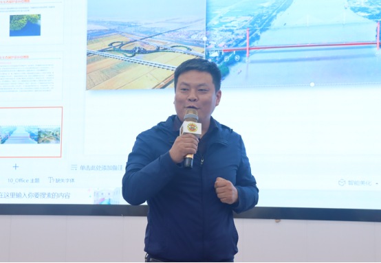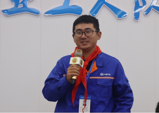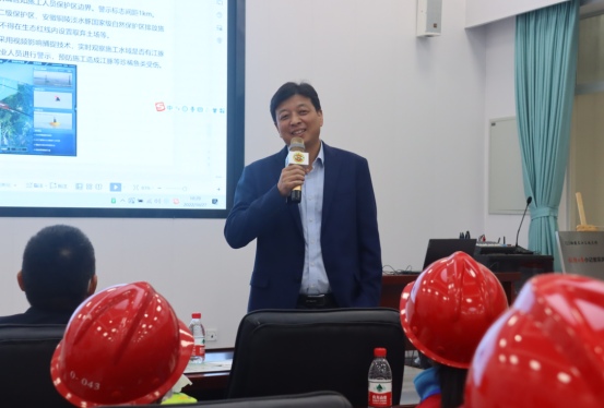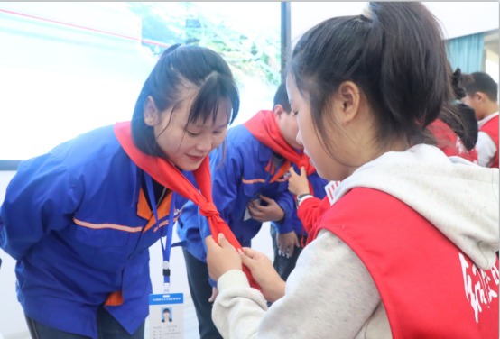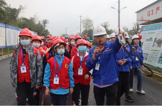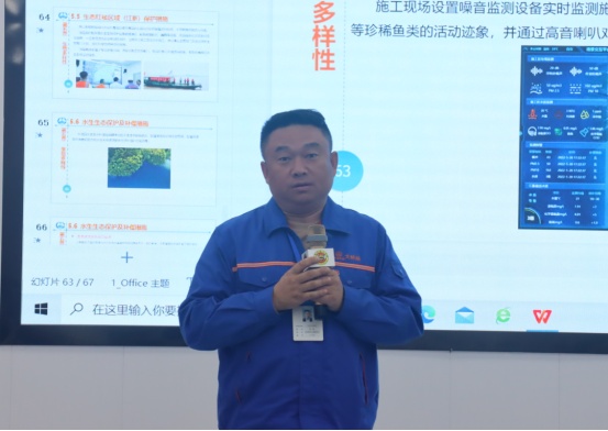 參觀結(jié)束后,小記者們來到展演廳,一起觀看G3橋建設(shè)宣傳片、聆聽G3橋安全總監(jiān)周啟輝講解生物多樣性相關(guān)知識(shí)以及G3橋建設(shè)期間對生物多樣性保護(hù)的措施。一張張?zhí)匦Ю瓭M的動(dòng)態(tài)效果圖,一幀幀凝聚著建筑工人汗水的畫面,給小記者們留下了深刻的印象。小記者代表們?yōu)榻ㄔO(shè)者們戴上鮮紅的紅領(lǐng)巾,表達(dá)對他們的崇敬之情。