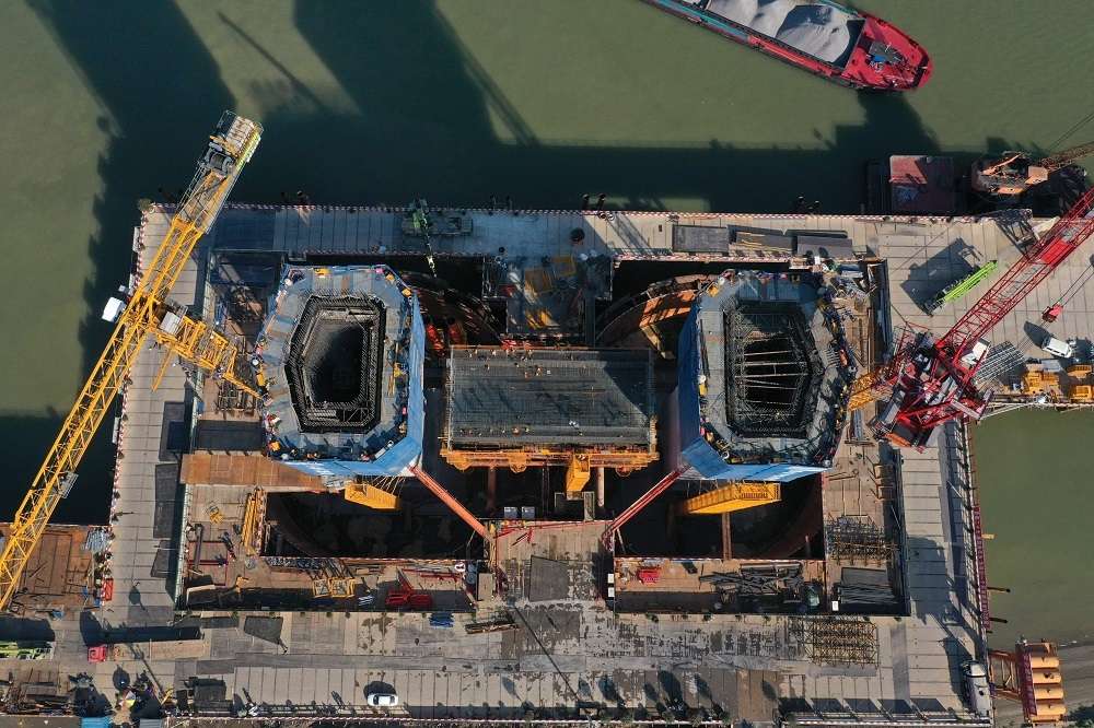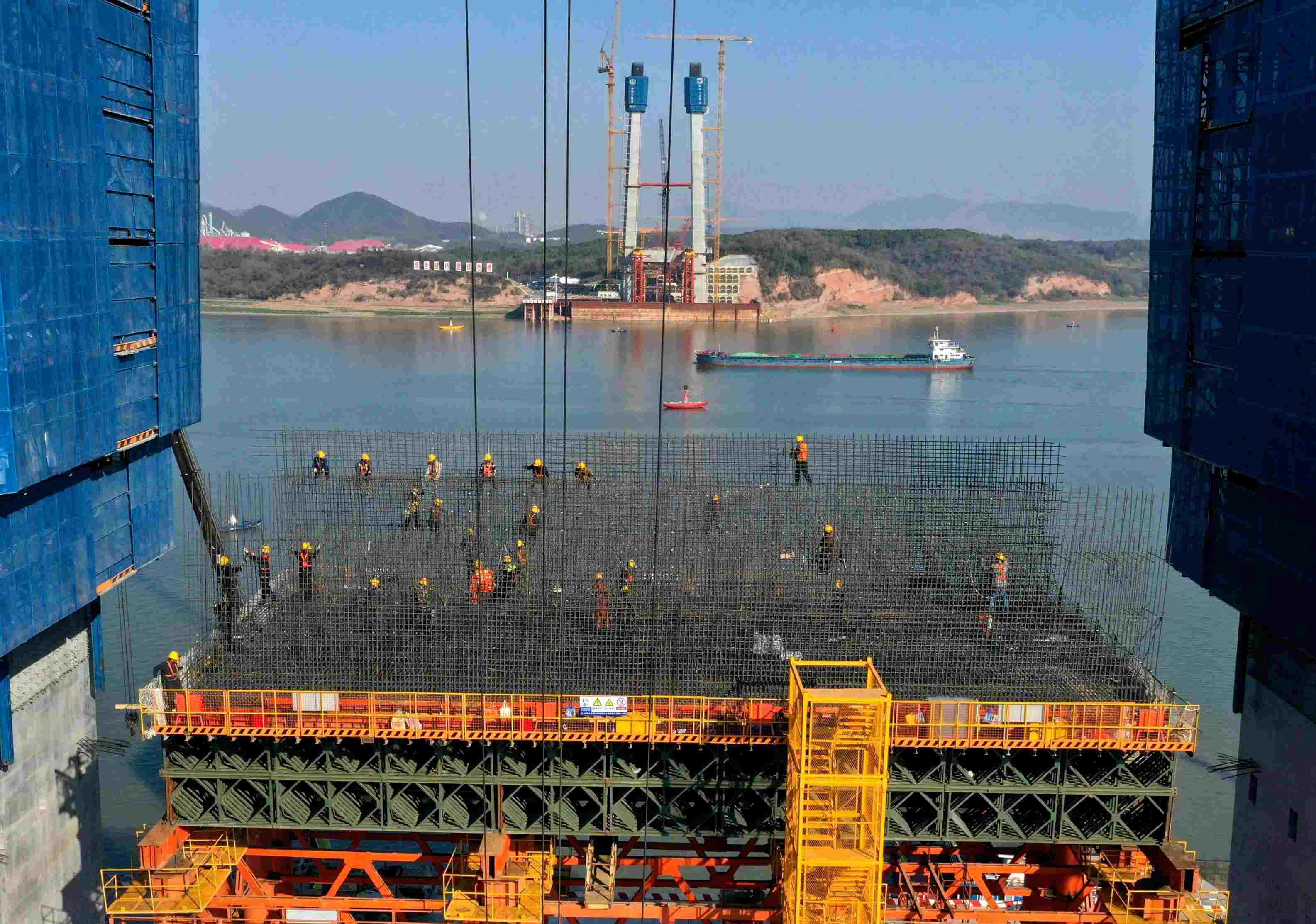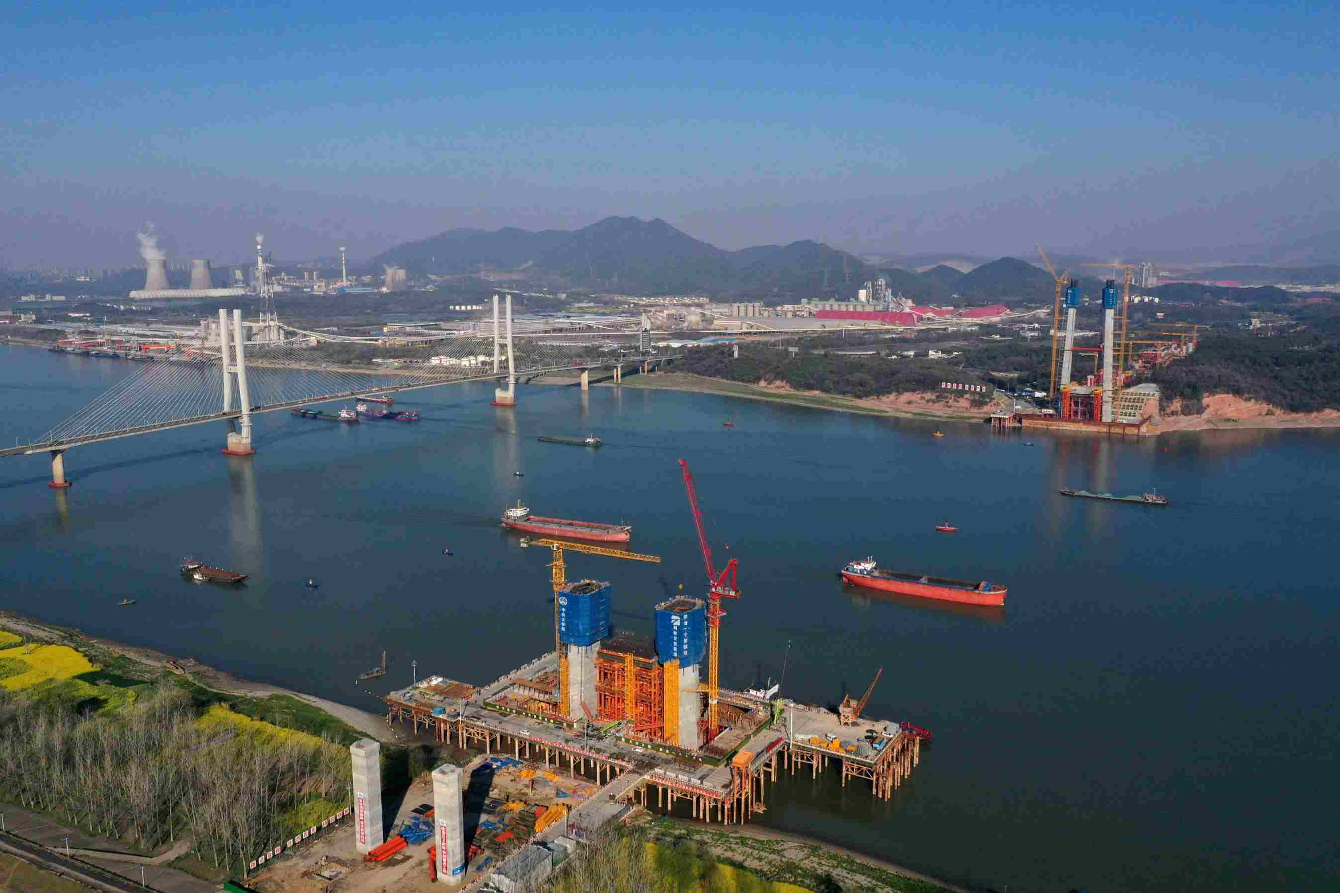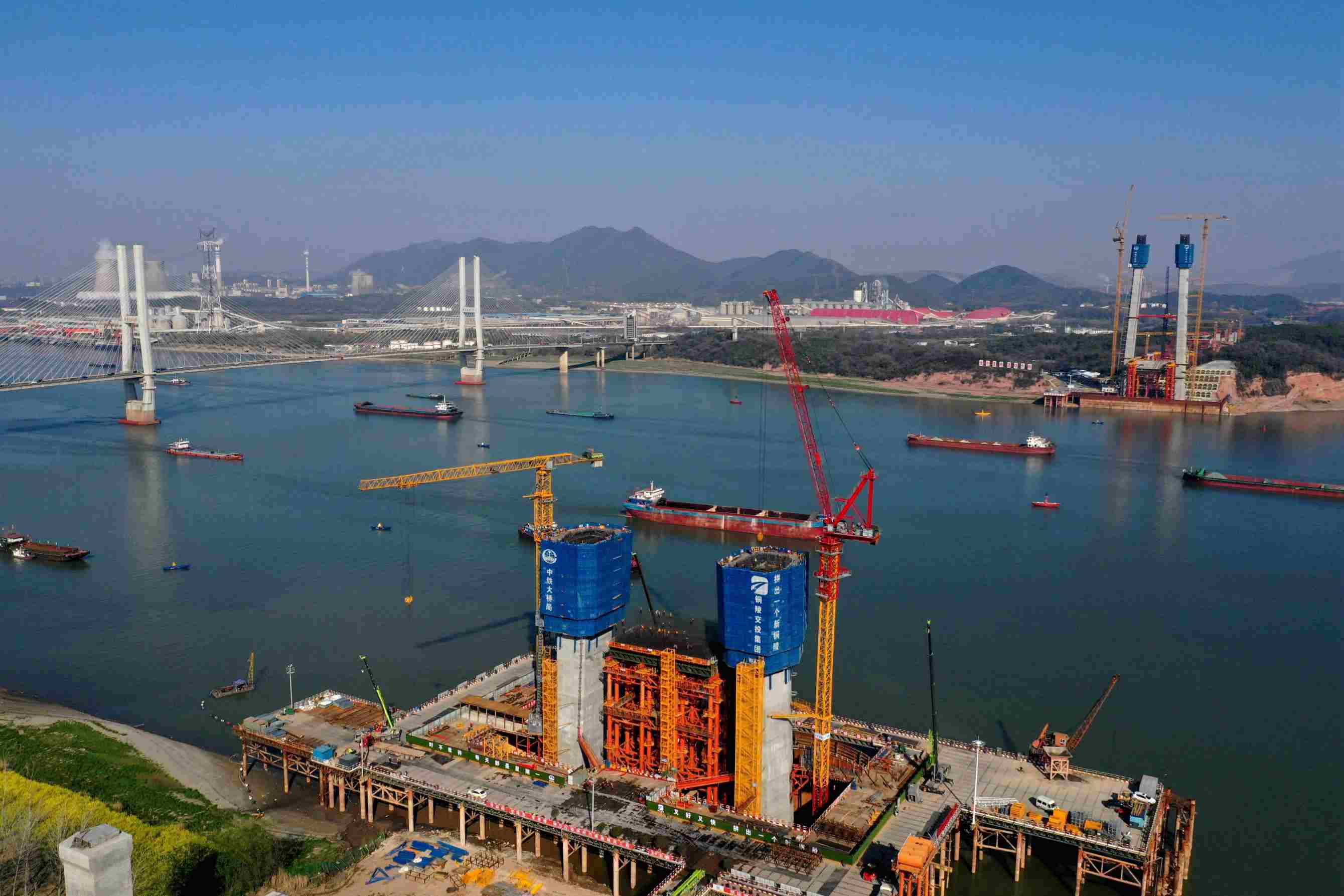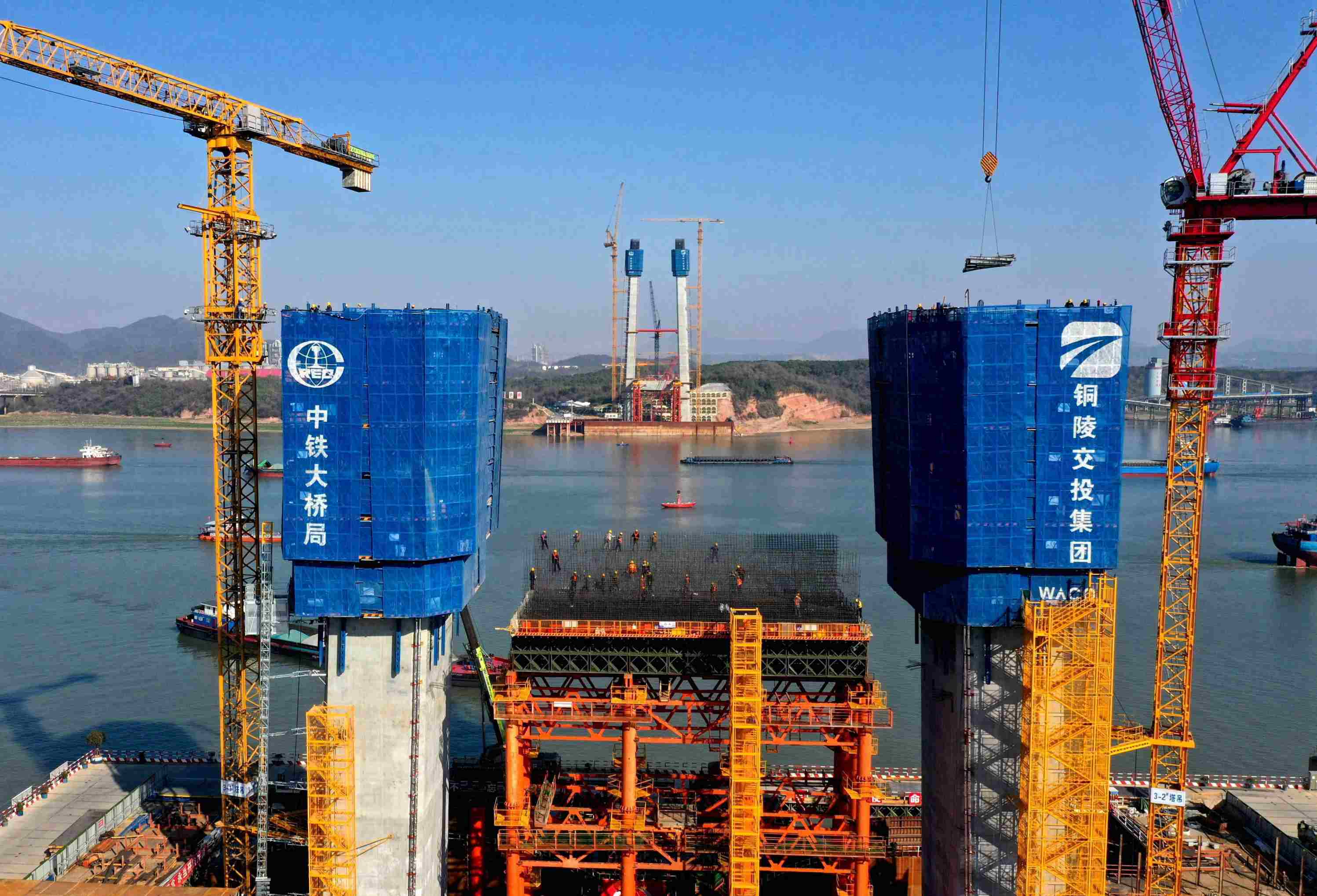 2023年3月13日,中鐵大橋局施工人員在G3(京臺(tái)高速)銅陵長(zhǎng)江公鐵大橋進(jìn)行3號(hào)主墩塔柱施工