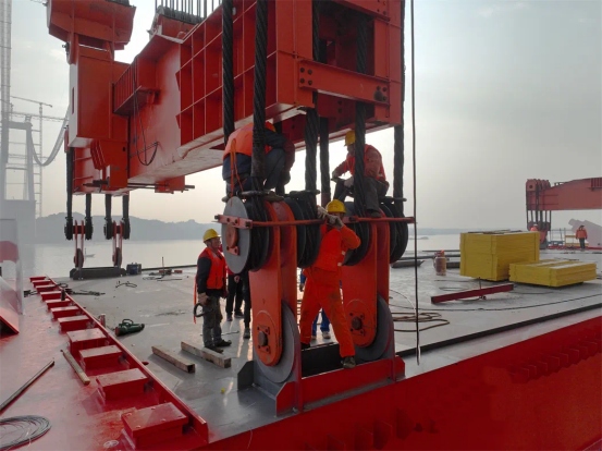 “經(jīng)過(guò)周密部署和精心準(zhǔn)備,第一節(jié)鋼梁架設(shè)比施工安排提前了3天?!敝需F大橋局G3大橋項(xiàng)目部一分部副經(jīng)理任引亮介紹,鋼梁由1600噸架梁吊機(jī)從江面駁船上吊到43米高的主塔下橫梁上,與導(dǎo)梁精準(zhǔn)拼接,隨即將已拼接鋼梁節(jié)段及架梁吊機(jī)整體向邊跨方向頂推,而后架梁吊機(jī)向主跨位置走行至架梁位置處繼續(xù)提升鋼梁,如此循環(huán)直至將邊輔跨鋼梁全部安裝完畢。
