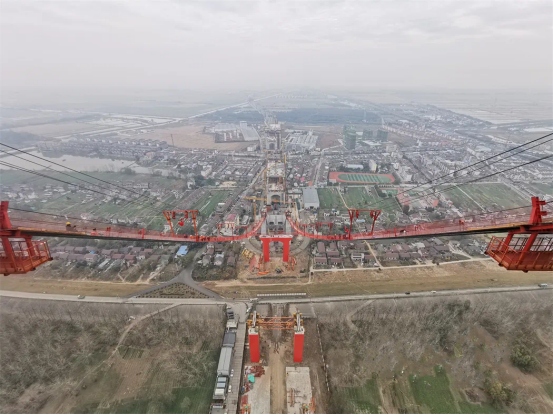 在長江水域之上,G3大橋南北主塔遙遙相望,由貓道和一根根纜索構(gòu)成的“紅色長龍”將南北兩岸緊緊相連,跨江大橋雄姿初現(xiàn),預(yù)計2024年2月初完成主纜架設(shè)。