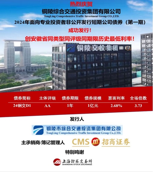 4月10日,銅陵交投集團(tuán)2024年第一期面向?qū)I(yè)投資者非公開短期公司債券成功發(fā)行,規(guī)模1億元,期限1年,票面利率2.68%,主承銷商招商證券。
