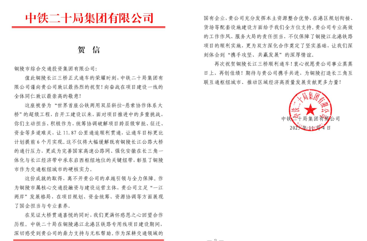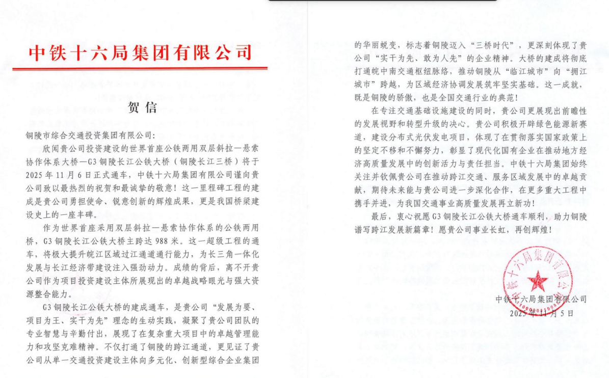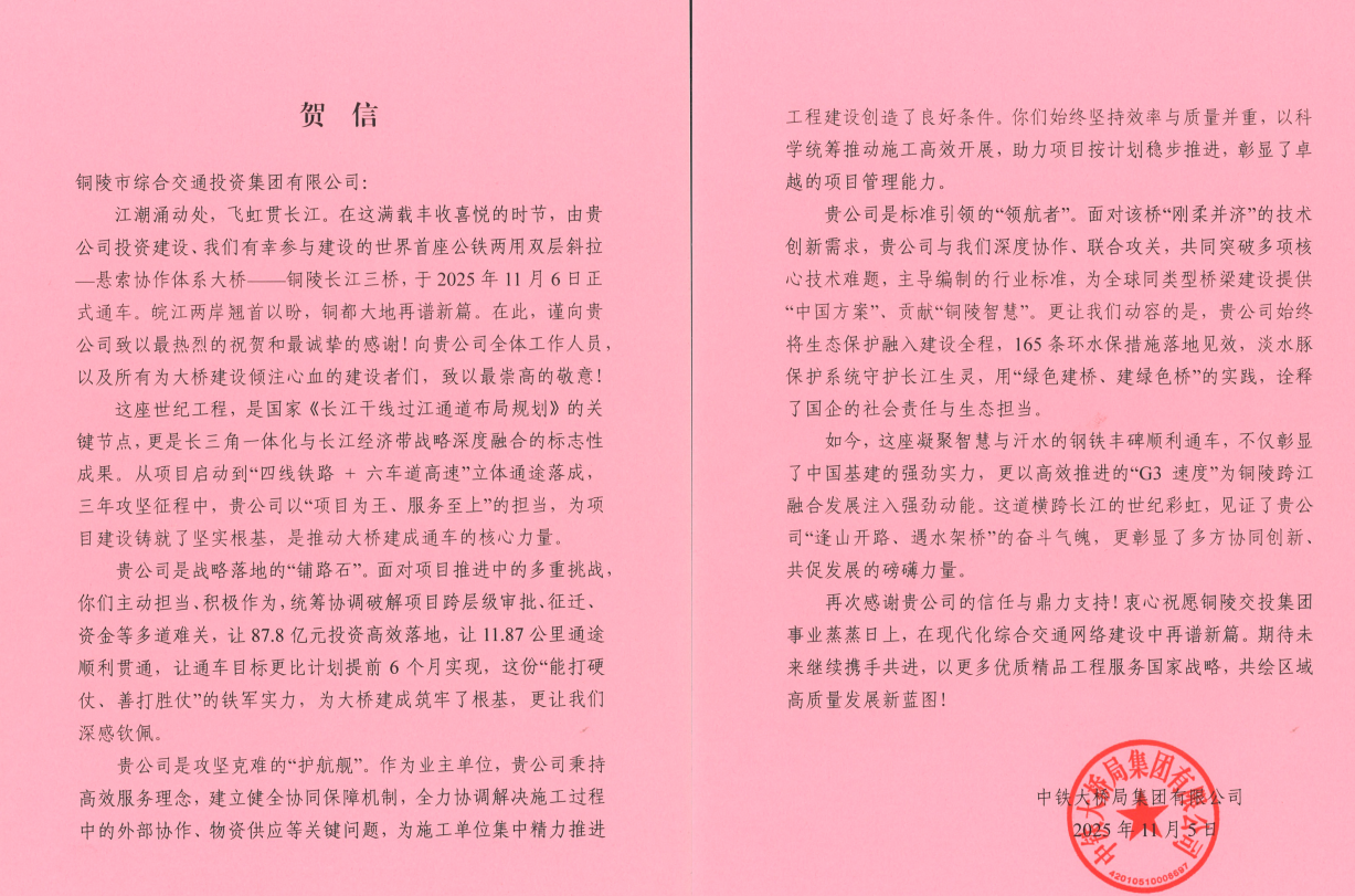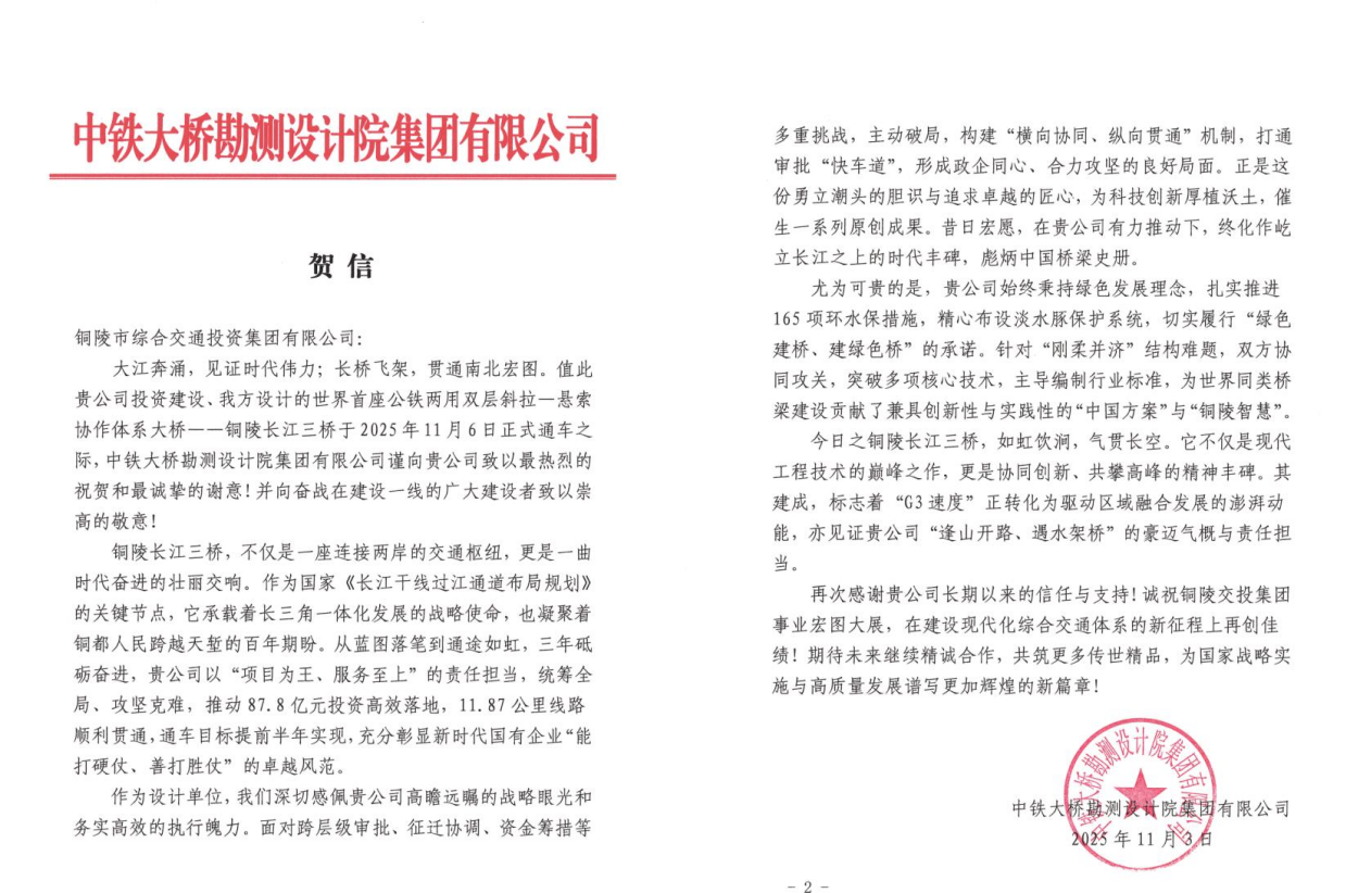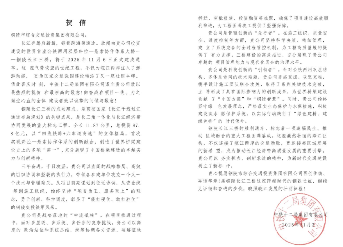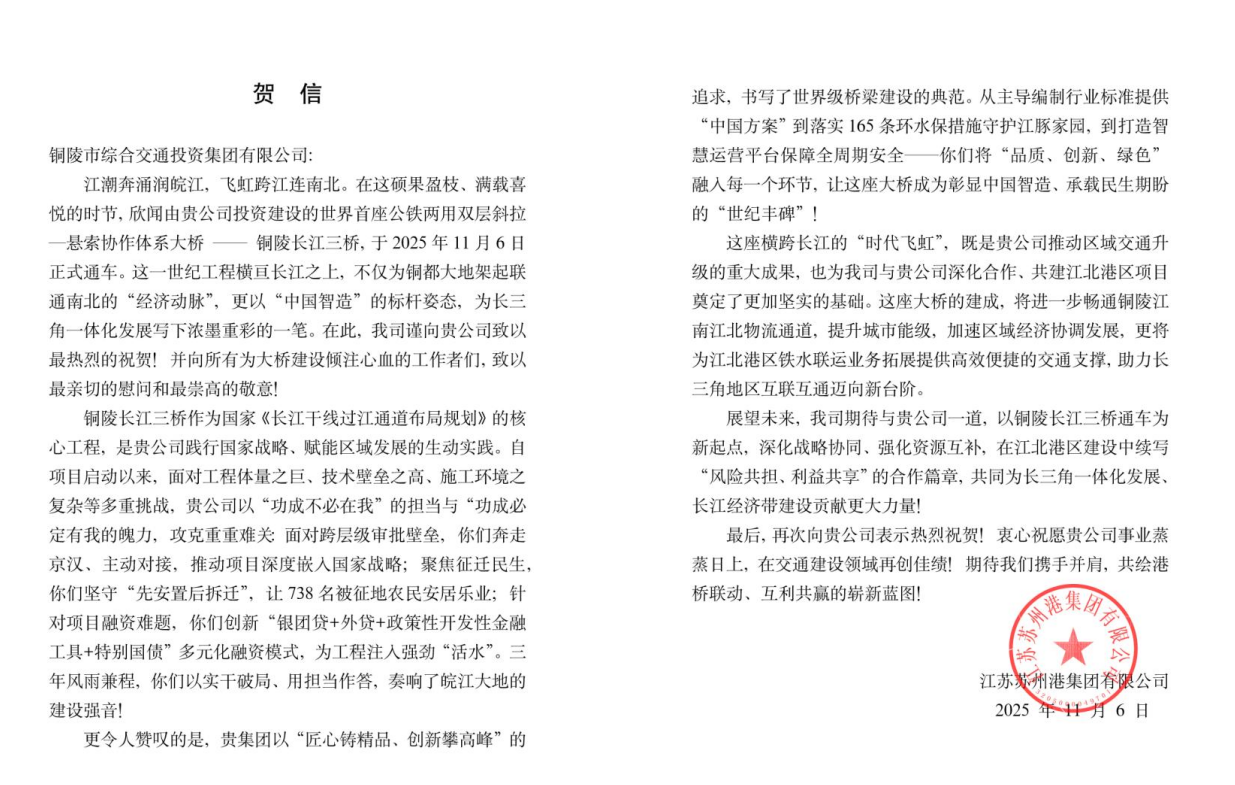 2025年11月6日,世界首座公鐵兩用雙層斜拉-懸索協(xié)作體系大橋——銅陵長江三橋正式通車!這一貫徹落實國家“一帶一路”、長江經(jīng)濟(jì)帶及長三角一體化發(fā)展戰(zhàn)略的重點(diǎn)工程,不僅刷新了橋梁建設(shè)的技術(shù)高度,更牽動著各方合作伙伴的心弦:鑄就“橋魂”的中鐵大橋局、中鐵大橋院等、注入金融活水的國開行等、擬攜手開發(fā)江北港區(qū)項目的蘇州港集團(tuán),以及共建江北港鐵路專用線的中鐵十六局、二十局等單位,紛紛致信銅陵交投集團(tuán),以賀信為禮,共慶這一改寫區(qū)域交通格局的歷史時刻。?