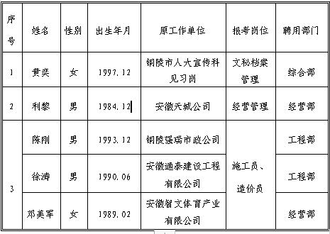 根據(jù)《銅陵市綜合投資集團有限公司(華越建設工程公司)公告》,現(xiàn)將相關崗位擬聘用人員名單公示如下: