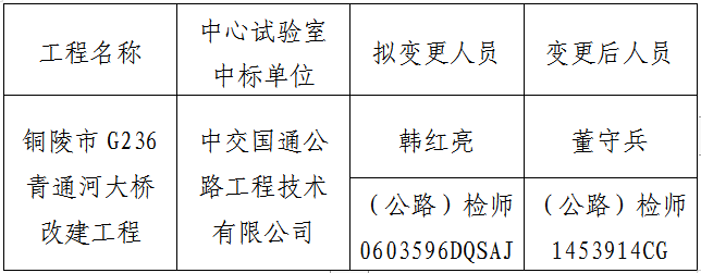 銅陵市G236青通河大橋改建工程中心試驗(yàn)室,于2019年9月29日開(kāi)標(biāo),中標(biāo)單位為中交國(guó)通公路工程技術(shù)有限公司。因原中標(biāo)項(xiàng)目負(fù)責(zé)人個(gè)人家庭原因,無(wú)法到崗履行合同責(zé)任與義務(wù),故中交國(guó)通公路工程技術(shù)有限公司申請(qǐng)中心試驗(yàn)室項(xiàng)目負(fù)責(zé)人變更。現(xiàn)將項(xiàng)目負(fù)責(zé)人變更情況予以公示,如有異議,請(qǐng)于7日內(nèi)向銅陵市綜合交通投資集團(tuán)有限公司反映。