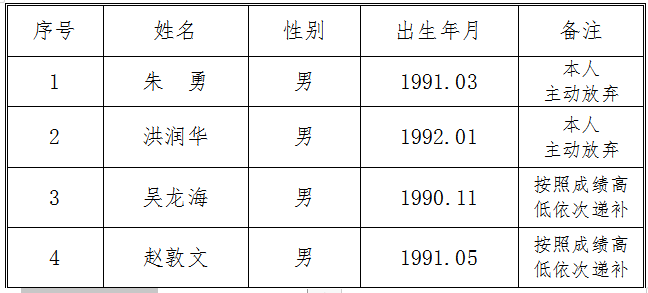 因出現(xiàn)部分考生自愿放棄情況,我公司對入圍體檢人員按照成績排名依次進(jìn)行遞補(bǔ)?,F(xiàn)將交投集團(tuán)司屬公司銅陵市江北公路管理有限責(zé)任公司收費(fèi)員、監(jiān)控員崗位招聘遞補(bǔ)入圍體檢人員名單公告如下: