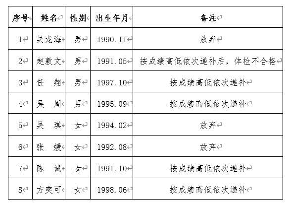 因出現(xiàn)部分考生自愿放棄情況,我公司對入圍體檢人員按照成績排名依次進(jìn)行遞補(bǔ)?,F(xiàn)將交投集團(tuán)司屬公司銅陵市江北公路管理有限責(zé)任公司收費(fèi)員、監(jiān)控員崗位招聘遞補(bǔ)入圍體檢人員名單公告如下: