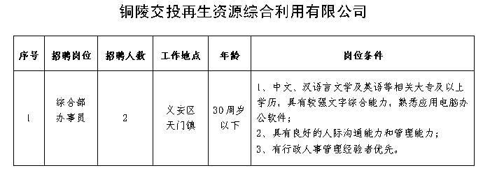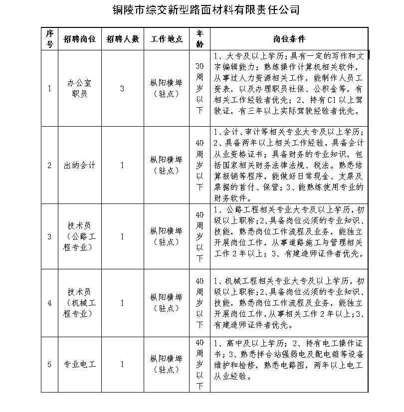 因業(yè)務(wù)發(fā)展需要,我公司司屬公司銅陵市綜交新型路面材料有限責(zé)任公司、銅陵交投再生資源綜合利用有限公司現(xiàn)面向社會公開招聘若干名工作人員,具體事項公告如下: