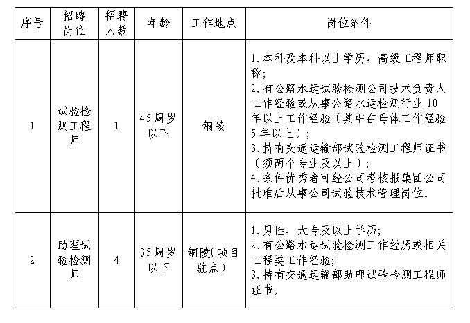 銅陵市綜合交通投資集團(tuán)有限公司司屬全資子公司銅陵市華信工程質(zhì)量檢驗(yàn)有限責(zé)任公司因經(jīng)營(yíng)發(fā)展需要,現(xiàn)面向社會(huì)公開招聘若干名工作人員,現(xiàn)將具體事項(xiàng)公告如下: