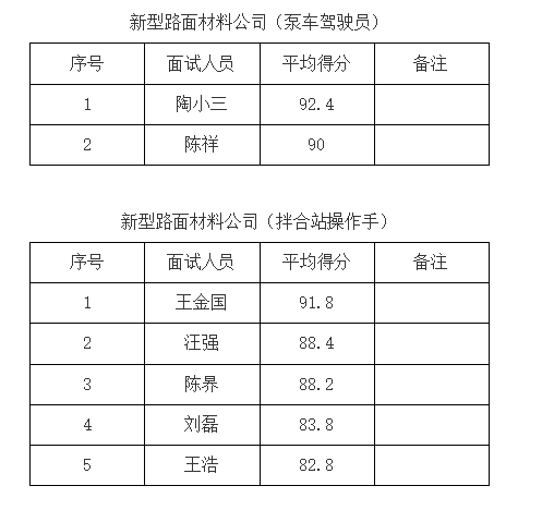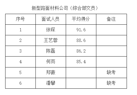 根據(jù)《銅陵市綜交新型路面材料有限責(zé)任公司公開招聘人員公告》,我公司已于2021年9月5日開展銅陵市綜交新型路面材料有限責(zé)任公司相關(guān)崗位面試工作,現(xiàn)將面試成績公示如下:
