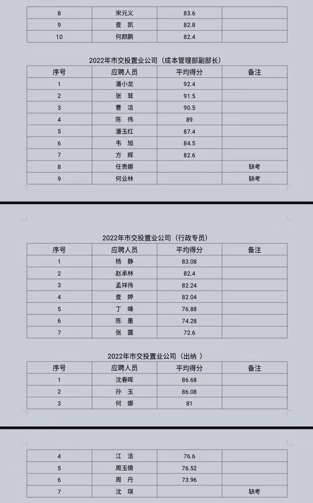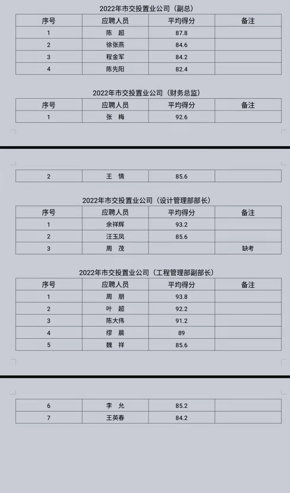 各位考生: 根據(jù)《銅陵交投置業(yè)有限公司公開(kāi)招聘人員公告》,我公司已于2022年2月17日開(kāi)展市交投置業(yè)公司副總、財(cái)務(wù)總監(jiān)、設(shè)計(jì)管理部部長(zhǎng)、工程管理部副部長(zhǎng)、成本管理部副部長(zhǎng)、行政專員、出納崗位的面試工作,現(xiàn)將報(bào)名參與人員面試成績(jī)公示如下: