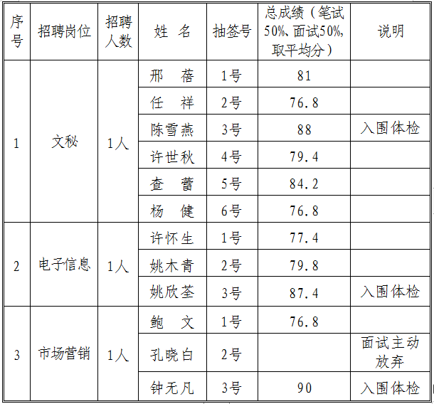 現(xiàn)將交投集團公司文秘、電子信息、市場營銷崗位招聘體檢入圍人員名單公示如下:
