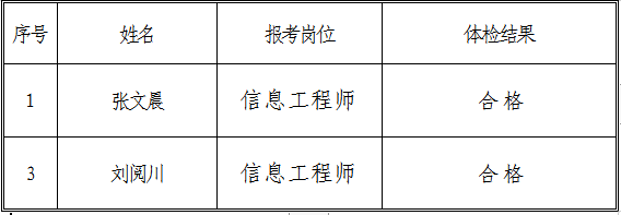 根據(jù)《銅陵市交通投資有限責(zé)任公司招聘人員公告》,集團(tuán)公司綜合部于2019年5月6日組織報考信息工程師職位的考生參加體檢,現(xiàn)將相關(guān)體檢結(jié)果向社會進(jìn)行公示: