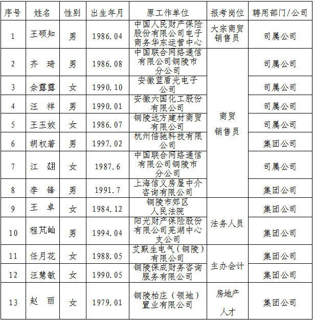 根據(jù)《銅陵市綜合交通投資集團(tuán)有限公司招聘人員公告》,現(xiàn)將相關(guān)崗位擬聘用人員名單公示如下: