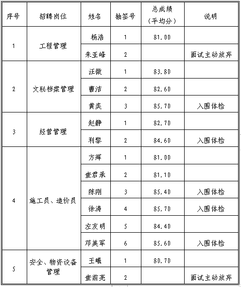根據(jù)應(yīng)聘者現(xiàn)場面試綜合能力表現(xiàn)情況,結(jié)合公司儲備人才需求,經(jīng)公司研究決定,現(xiàn)將招聘情況公示如下: