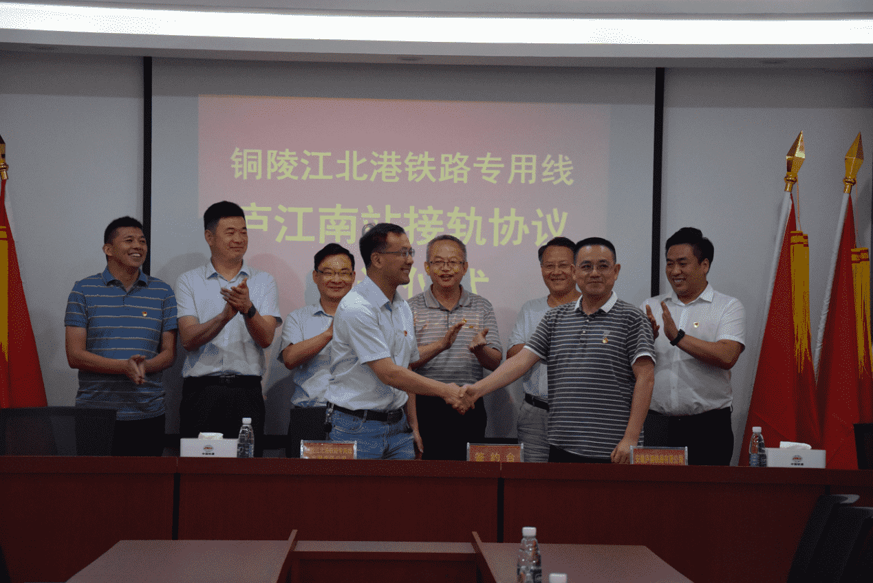 6月29日下午,在銅陵市發(fā)改委副主任、鐵路辦主任謝永明的見證下,集團(tuán)公司黨委委員、副總經(jīng)理兼銅陵江北港鐵路專用線有限責(zé)任公司董事長(zhǎng)、總經(jīng)理黃勇與安徽廬銅鐵路有限公司總經(jīng)理汪學(xué)軍在合肥簽訂了江北港鐵路專用線廬江南站接軌協(xié)議,江北港鐵路專用線與廬銅鐵路將在廬江南站實(shí)現(xiàn)互聯(lián)互通。江北港鐵路公司副總經(jīng)理高家立、廬銅鐵路公司副總經(jīng)理王海東等參加活動(dòng)。
