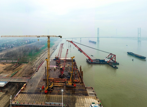4日上午8時30分,位于長江北岸G3銅陵長江公鐵大橋3號墩的施工現(xiàn)場,上百名橋梁建設(shè)者正在進(jìn)行施工平臺的鋪設(shè)和完善,以及鋼護(hù)筒的插打作業(yè)。現(xiàn)場塔吊林立,焊花四濺,一派繁忙的景象。中鐵大橋局G3銅陵長江公鐵大橋項目部一分部黨支部書記趙懿告訴記者,目前大型吊船、履帶吊、塔吊、旋挖鉆機(jī)等大型設(shè)備已經(jīng)到位,“2022年,我們計劃實施橋墩鉆孔樁、承臺、墩身等施工,年度計劃投資10億多元?!?