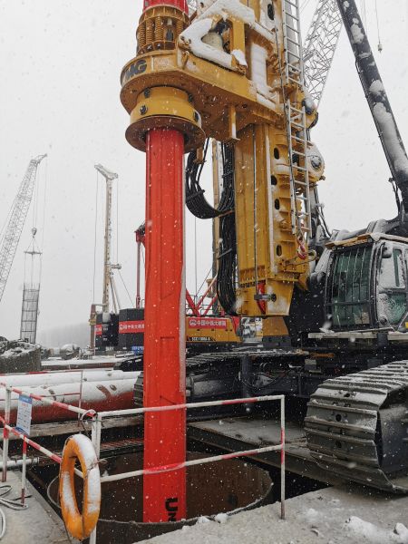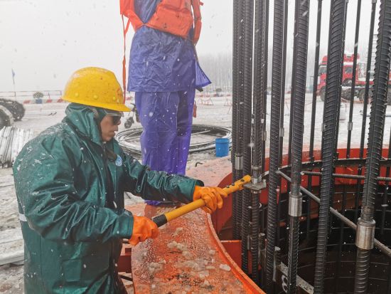 中新網(wǎng)安徽新聞2月7日電 (通訊員趙懿 完顏亮) 2月7日上午,連續(xù)十幾個(gè)小時(shí)大雪后,地上積雪已達(dá)到七八厘米厚,中鐵大橋局G3銅陵公鐵長江大橋現(xiàn)場在大雪中大干。3#主墩,5臺旋挖鉆在同時(shí)施工,工人們冒著寒冷和大雪在安裝鉆孔樁的鋼筋籠。項(xiàng)目部為工人配發(fā)了雨衣、保溫棉服等御寒安全用品,保障安全作業(yè)。