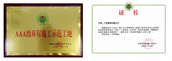 日前,從安徽省環(huán)境保護(hù)產(chǎn)業(yè)協(xié)會(huì)傳來(lái)佳訊,銅陵港江北港區(qū)鐵路專用線項(xiàng)目中鐵二十局施工管段喜獲安徽省2023年度“AAA級(jí)環(huán)保施工示范工地”榮譽(yù)稱號(hào)。