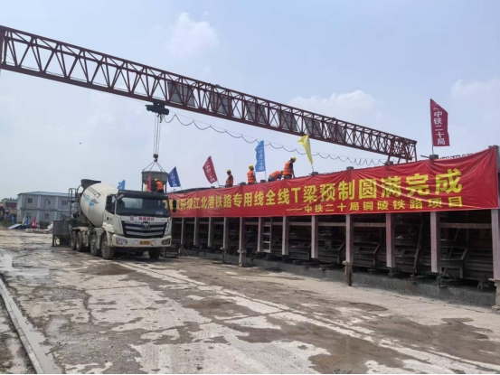 5月26日,隨著最后一車混凝土緩緩注入模板,銅陵江北港鐵路專用線項目中鐵二十局廬江制梁場順利完成最后一片T梁澆筑任務(wù)。至此,銅陵江北港鐵路專用線項目全線1192片T梁預(yù)制任務(wù)圓滿收官,標(biāo)志著項目土建施工取得重大進(jìn)展,橋梁上部結(jié)構(gòu)施工步入全面沖刺階段。