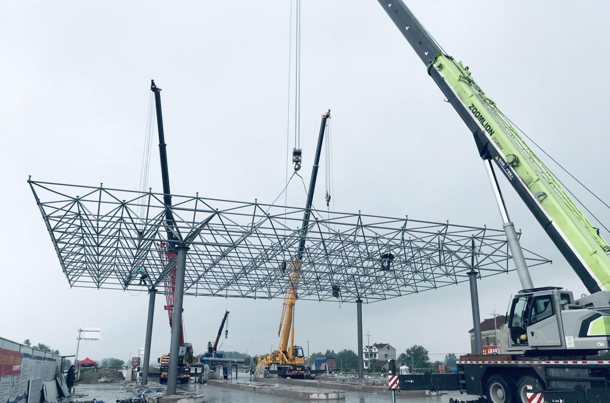 7月12日,G347湯溝收費(fèi)區(qū)完成收費(fèi)大棚半幅網(wǎng)架吊裝,預(yù)計(jì)7月底完成全部收費(fèi)大棚網(wǎng)架吊裝。